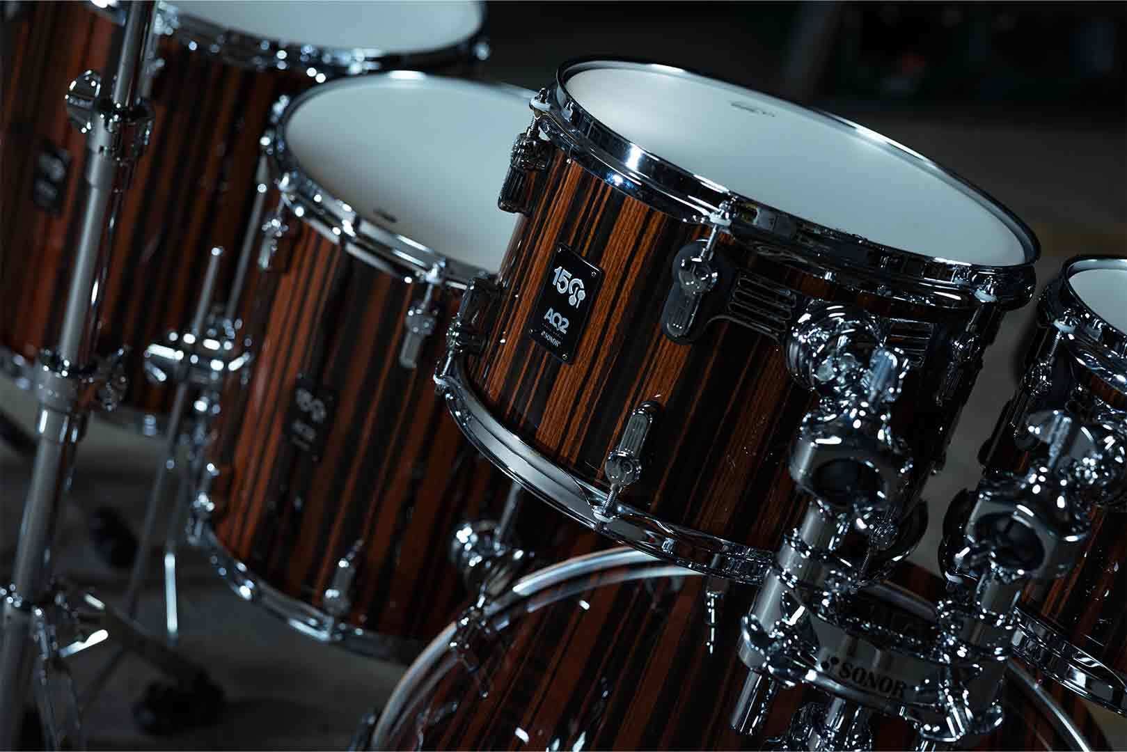 Marking Sonor’s 150-year legacy, this ultra-limited edition shell pack (just 500 sets worldwide) builds on the high-performance AQ2 platform with 8-ply shells made from 100% North American and Chinese maple, featuring a striking vertical-grain ebony replica veneer finished in high gloss lacquer. The kit includes a 22″ × 17.5″ bass drum, 10″ & 12″ rack toms, 13″ & 16″ floor toms, a 14″ × 6″ snare, and a DTH-4000 double-tom holder - ideal for pro setups or collectors alike. Premium hardware like die-cast lugs with TuneSafe, SmartMount suspension, triple-flanged hoops, and matching anniversary branding across badges and the bass drum head elevate it from standard AQ2 quality to something truly commemorative and visually striking.
